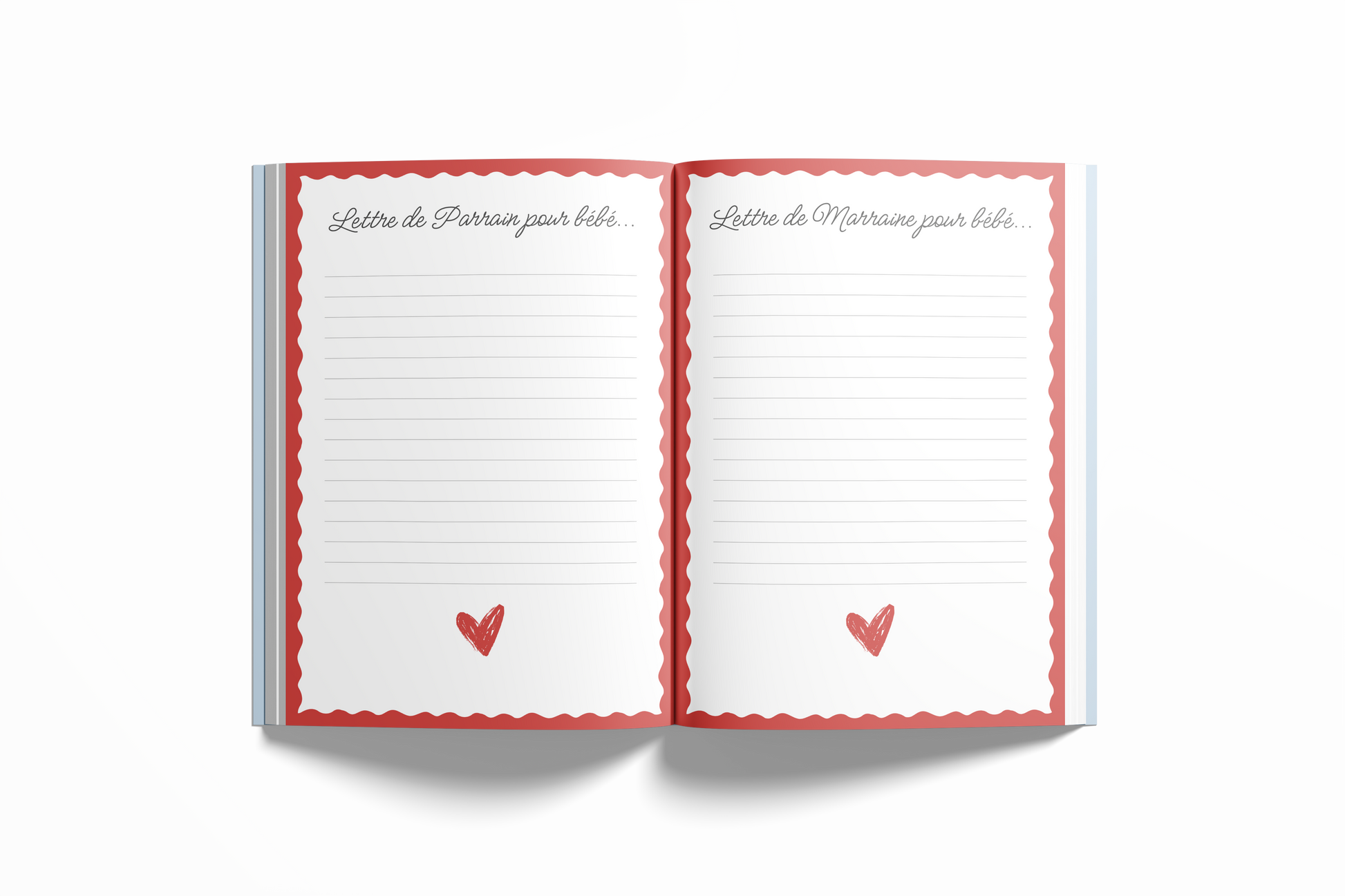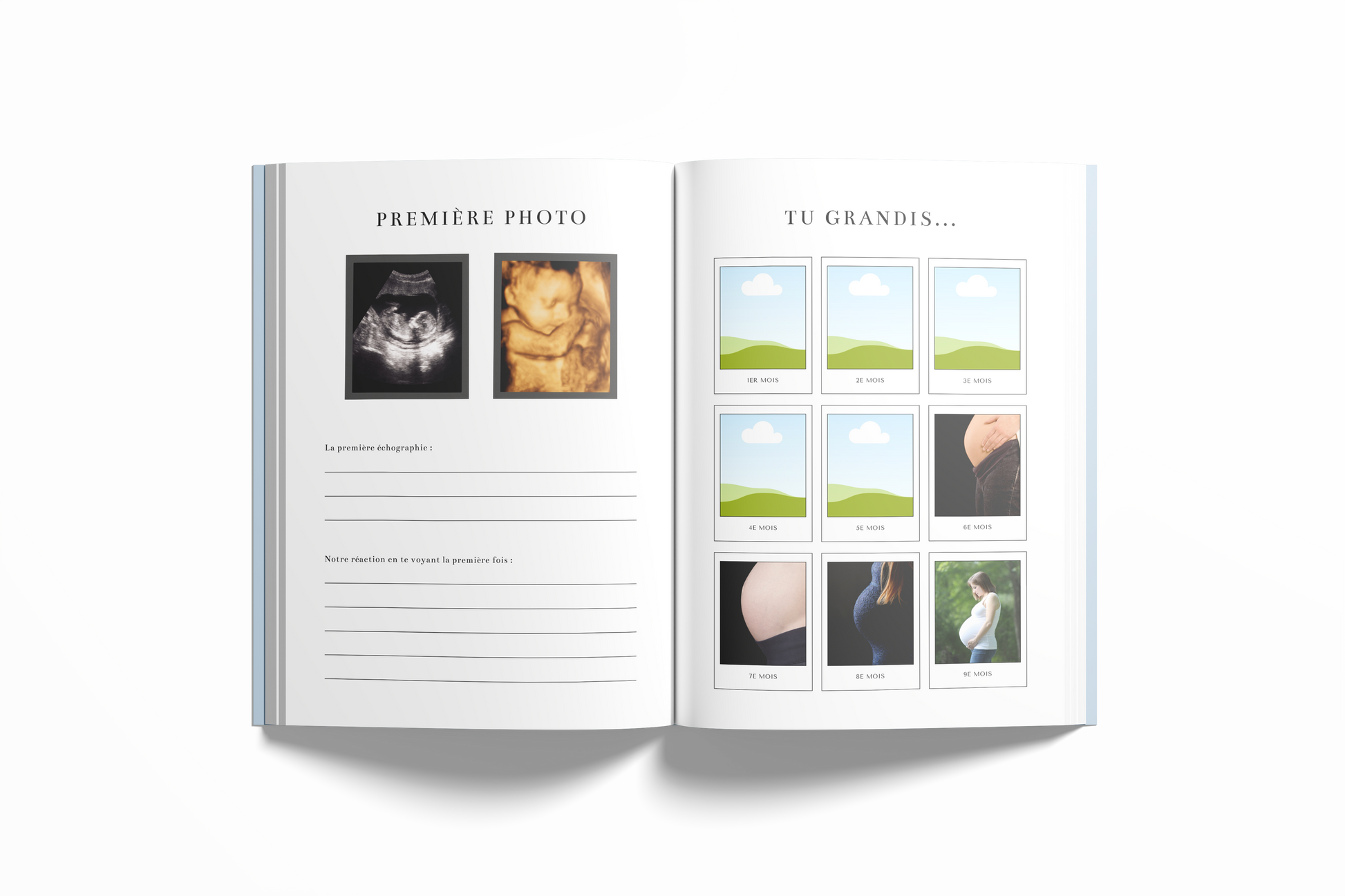 - 59 pages soigneusement conçues couvrant chaque étape de la grossesse et première année de bébé : photos de grossesse, récit de naissance, échographies, parrain et marraine, anniversaire, Noël...