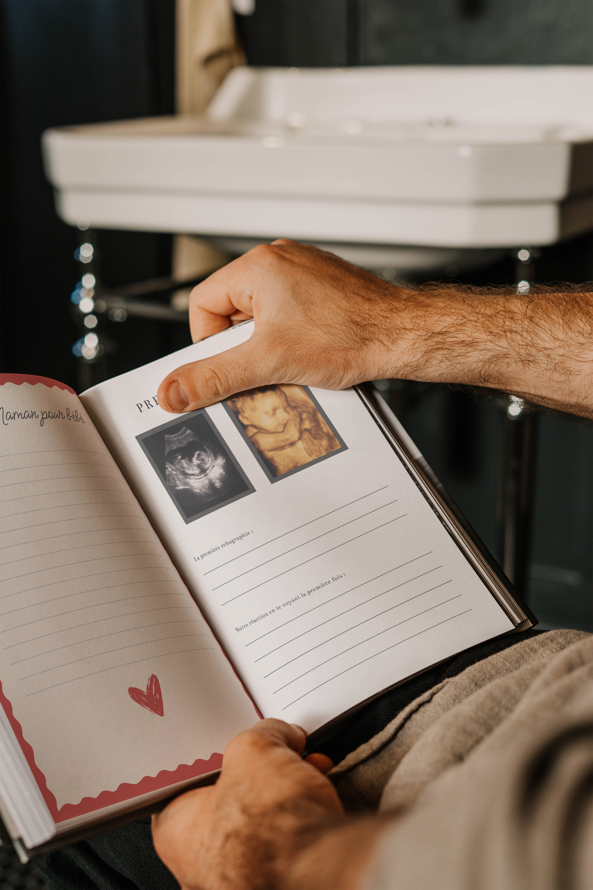 - 59 pages soigneusement conçues couvrant chaque étape de la grossesse et première année de bébé : photos de grossesse, récit de naissance, échographies, parrain et marraine, anniversaire, Noël...
