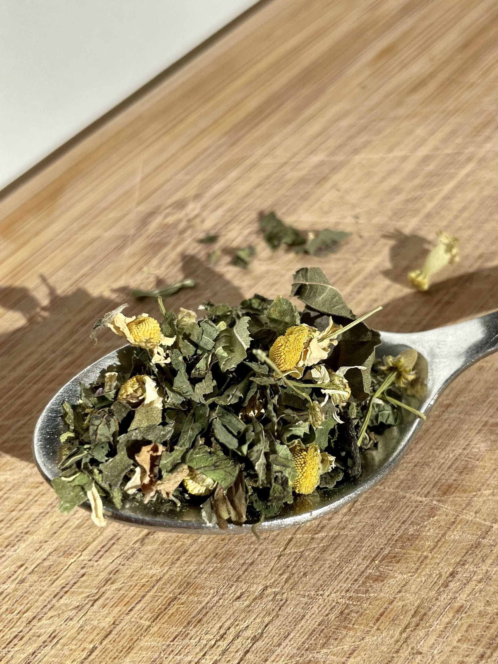 Verveine odorante, Mélisse, Menthe poivrée, Camomille matricaire. Plantes 100% biologiques.